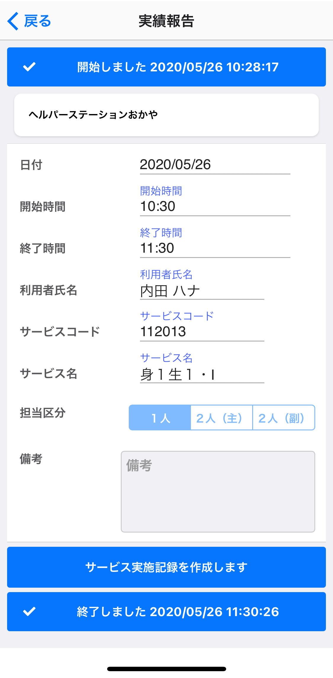 また、サービス提供後の報告は、アプリより簡単なタップ操作で入力し、「サービス実施記録票」として出力できます。