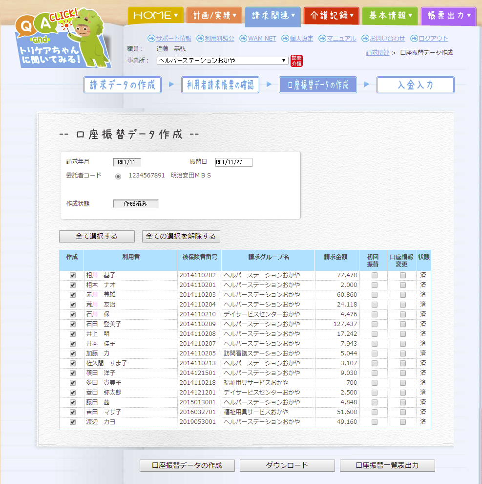 金融機関へ提出する利用料の口座振替データ(全銀協フォーマット対応)を作成できます。