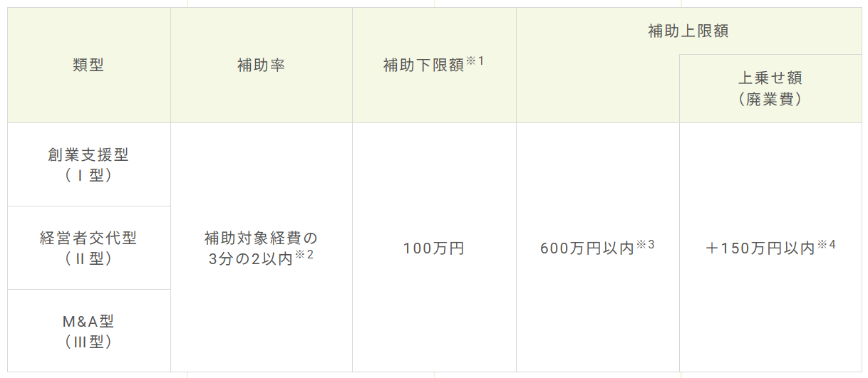 - 以下は種類ごとの補助金額・用途・補助率です。