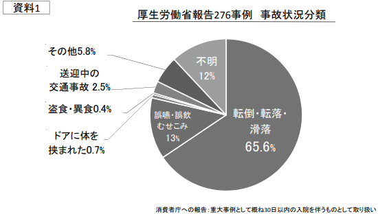 厚生労働省の報告によると、介護施設内で最も多い事故は、転倒・転落・滑落が181件で65.6%を占めており、次いで誤嚥・誤飲・むせこみが36件で13%となりました。