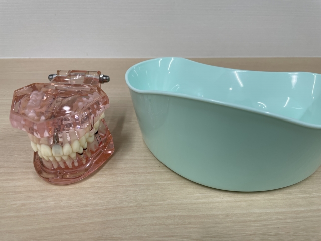口をゆすいだ水やケア中に出た汚れを受け止めるための容器です。ベッド上でも使用できるように設計されており、介助する側にとっても便利な道具です。