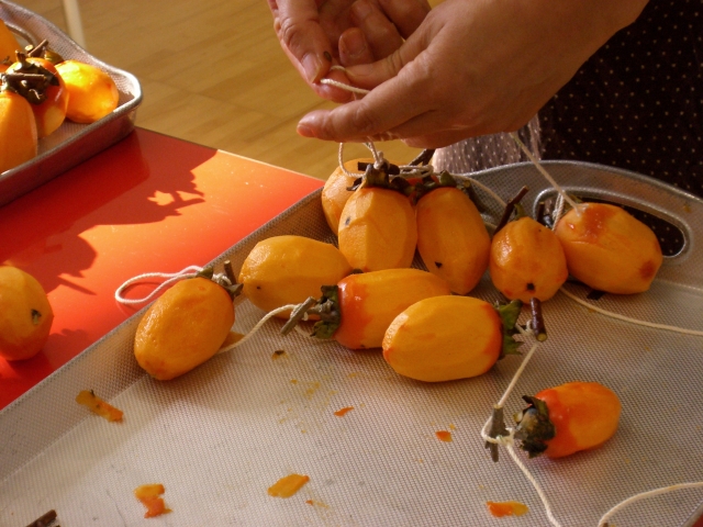 - 柿のヘタ部分にひもを結び、沸騰したお湯に数秒付けて殺菌。アルコールまたは焼酎で表面を軽く消毒。