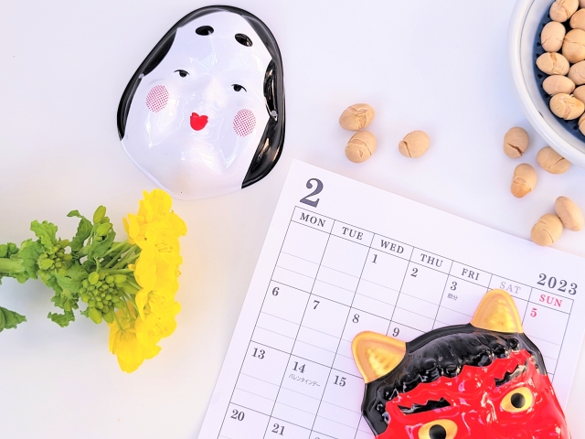 2月は、以下のようなイベントや記念日があります。節分は、立春の前日のことで、病気や災害などの厄災を鬼に見立てて追い払い、一年の無病息災を祈る日です。豆まきを行ったり恵方巻を食べる風習があります。針供養は折れたり錆びたりして使えなくなった針を供養し、針仕事の上達や無事を祈る行事です。古い針を豆腐やこんにゃく、餅など柔らかいものに刺して供養するのが一般的です。建国記念日は日本神話に登場する初代神武天皇即位が即位された日とされています。涅槃会はお釈迦さまが入滅された日にその死を偲んで行われる仏教の法要です。天皇誕生日は第126代天皇の悠仁様の御誕生日をお祝いする日です。