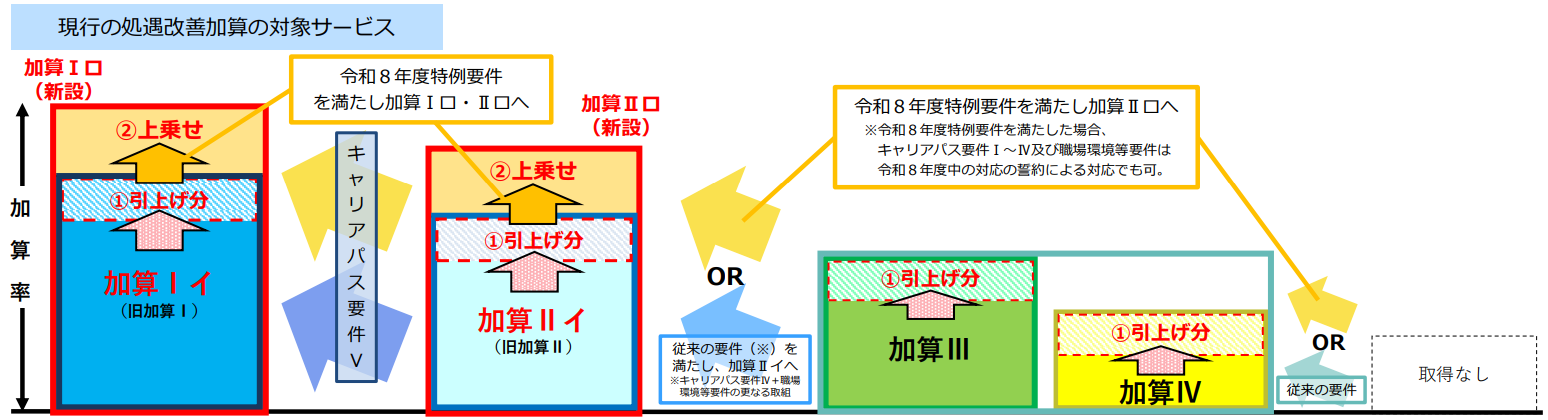 令和8年度特例要件を満たすことで、加算Ⅰイが加算Ⅰロに、加算Ⅱイが加算Ⅱロに引き上げられました。