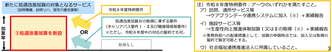 新たに処遇改善加算に加えられるサービスは(Ⅳ)に準ずる要件(キャリアパス要件Ⅰ・Ⅱ及び職場環境等要件を区分ごとに1つ以上)またはケアプランデータ連携システムに加入することで算定が可能です。(要件を満たす見込みでも可能)