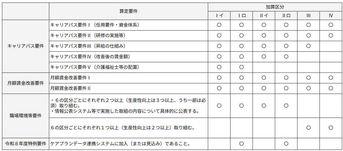 「キャリアパス要件」「月額賃金改善要件」「職場環境等要件」の3つの要件区分と「令和8年度特例要件」については以下にて詳しく解説いたします。