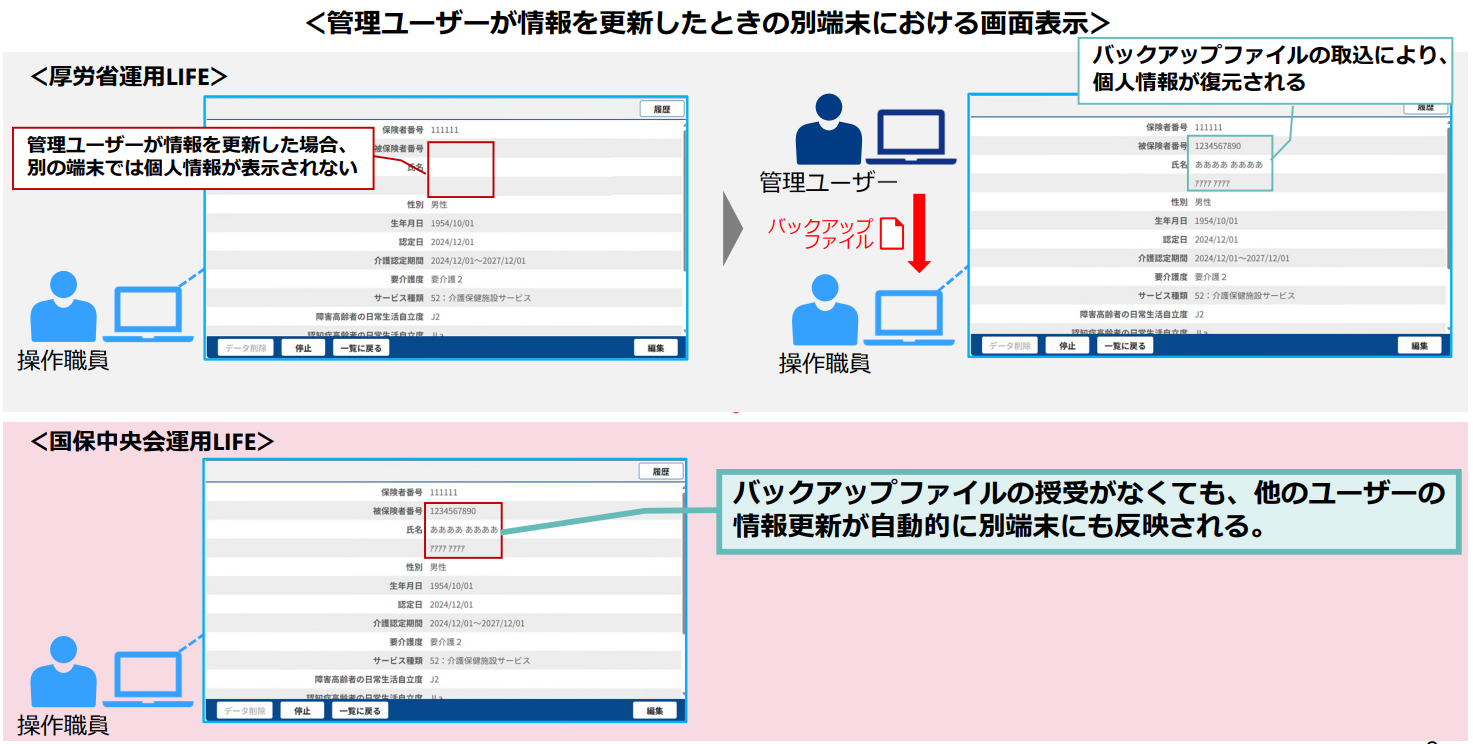 国保中央会運用LIFEではバックアップファイルの授受が不要となり、利便性が向上しています。厚労省運⽤LIFEは、利⽤者の個⼈情報を事業所の端末内に保存しているため、操作職員が管理ユーザーと別の端末を利用している場合は、個人情報の表示のためにはバックアップファイルの授受が必要でした。国保中央会運用LIFEでは、利⽤者の個⼈情報をLIFEのサーバ上に保持するため、バックアップファイルの授受が不要となりました。