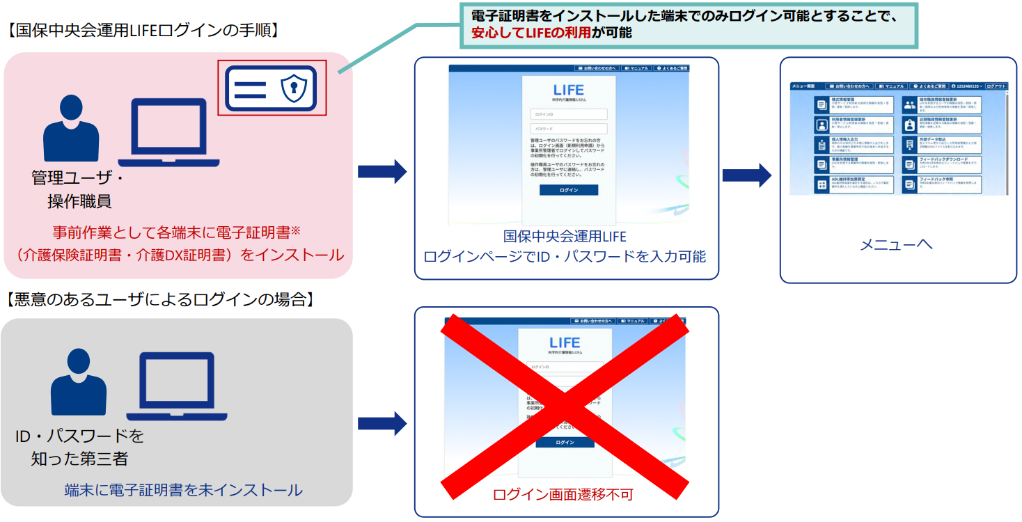 セキュリティ向上の仕組みとして、国保中央会運用LIFEでは電子証明書を用いた認証の仕組み(介護保険資格確認等WEBサービスと同様の仕組み)が設けられました。電子証明書をインストールした端末でのみログイン可能とすることで、ID・パスワードを知った第三者によるログインを防止できます。