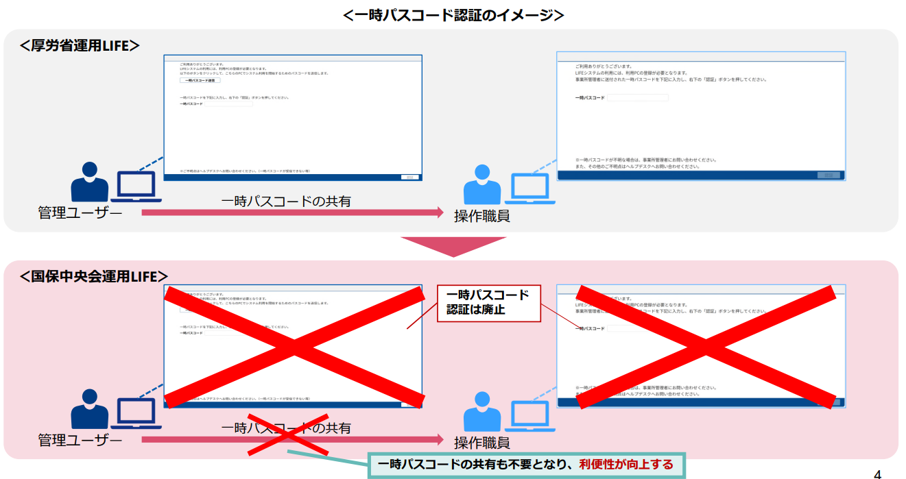 厚労省運⽤LIFEは、端末毎に⼀時パスコード認証を⾏う必要がありましたが。国保中央会運用LIFEでは、⼀時パスコード認証が不要となり、利便性が向上しました。