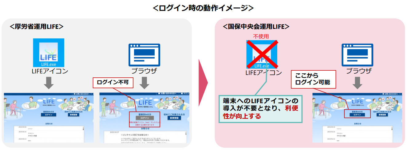 厚労省運⽤LIFEは、各職員の端末に導入したLIFEアイコンからログインする必要がありました。国保中央会運用LIFEでは、LIFEホームページのリンクからログイン可能となり、端末へのLIFEアイコンの導⼊が不要になり、利便性が向上しました。