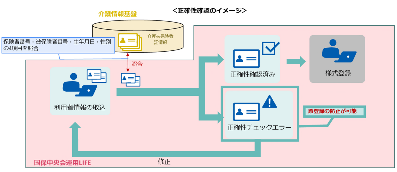 国保中央会運用LIFEでは、新規登録または登録済みの利⽤者情報について、介護情報基盤で保有する利⽤者本⼈に関する資格情報(介護被保険者証情報)との照合により、被保険者本人であることの正確性を確認する機能が設けられました。(照合する項目:保険者番号・被保険者番号・⽣年⽉⽇・性別の4項目)画⾯⼊⼒・CSV取込の両⽅で正確性チェックが⾏われます。