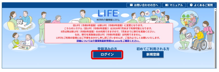 処理完了の目安は、事業所側でのシステム移行作業実施の翌日です。時間をおいてからログインしてください。1 日たってもログインできない場合は、厚労省LIFEの[問い合わせ入力]画面からヘルプデスクにお問い合わせください。