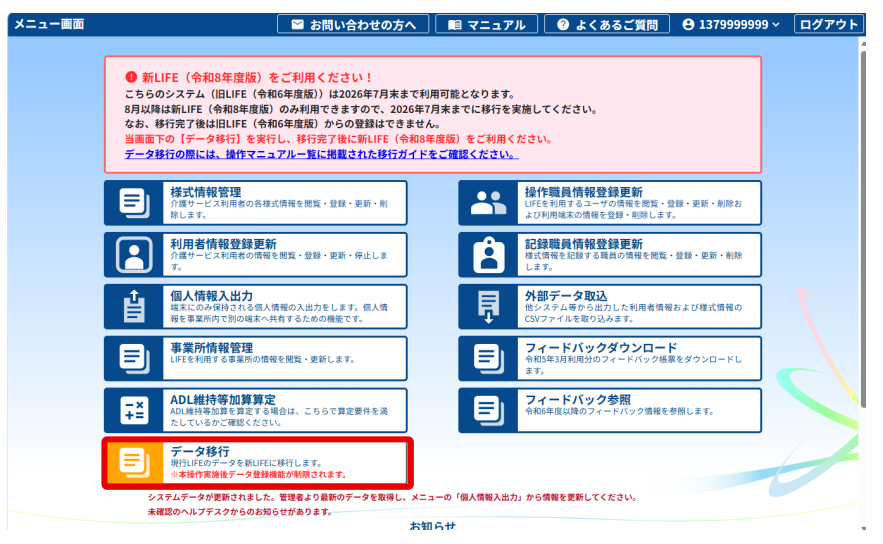 移行の操作は厚労省LIFEから管理ユーザが行います。移行作業が実施できるのは一度だけのため注意しましょう。移行作業後、厚労省LIFEではデータの登録/更新/削除ができなくなり、データの参照のみ可能となります。