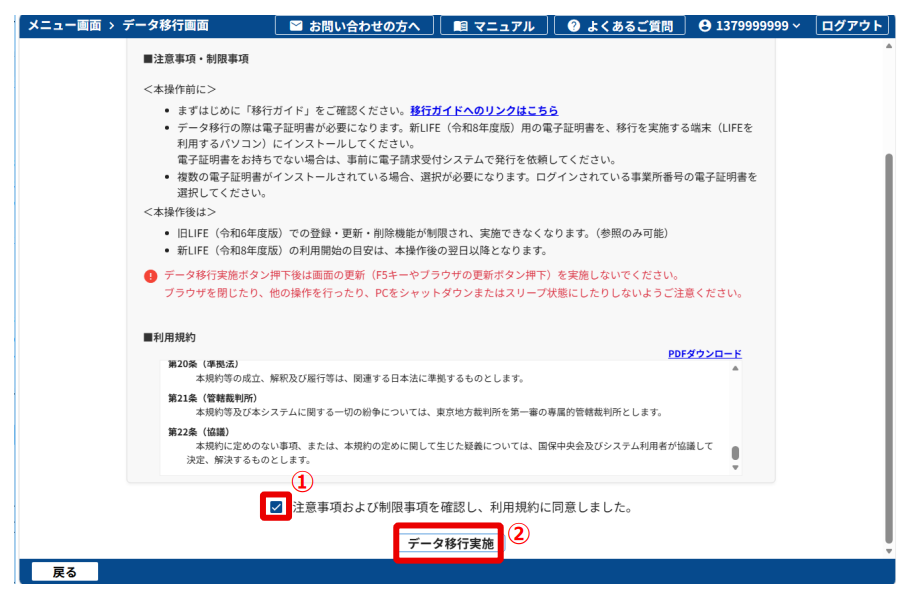 5.[注意事項および制限事項を確認し、利用規約に同意しました。] にチェックを付け(①)、[データ移行実施](②)をクリックします