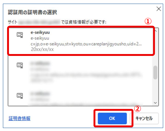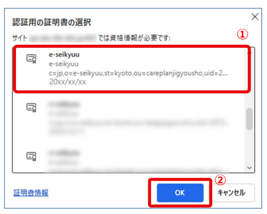 7.事前準備でインストールした電子証明書を選択し(①)、[OK]を クリックします(②)