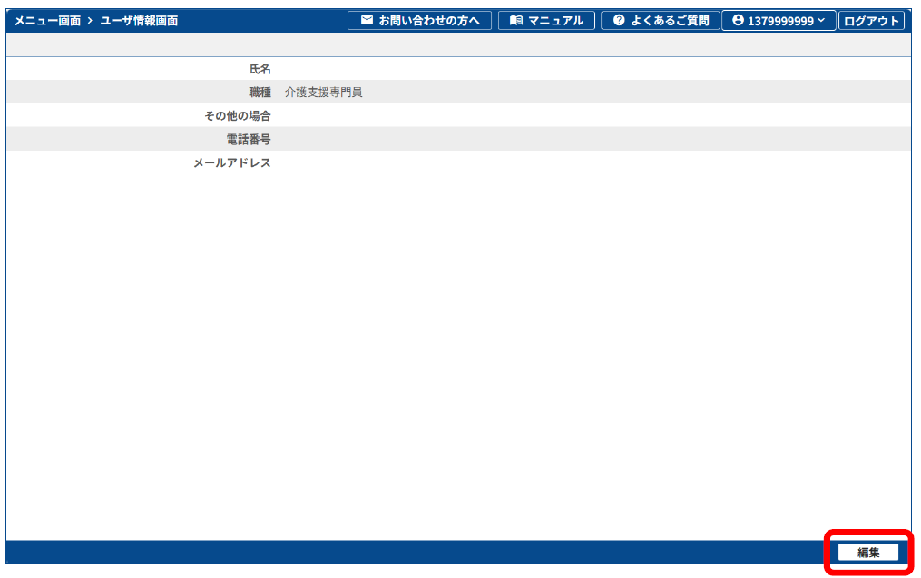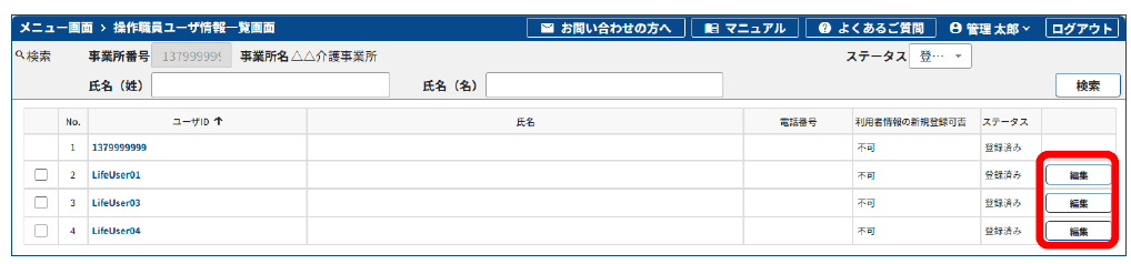 3.[操作職員ユーザ情報一覧]画面で[編集]をクリックします