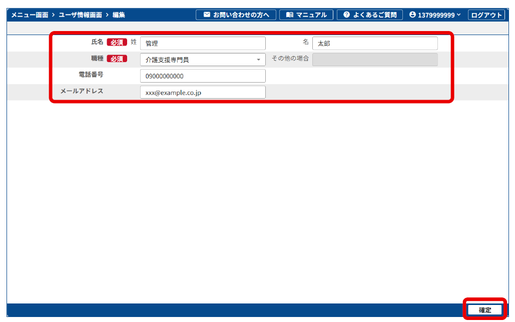 3.[編集]をクリックすると管理ユーザ情報の登録画面が表示されます
