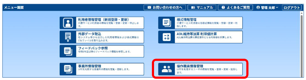 1.国保中央会LIFEのメニュー画面で[操作職員情報管理]をクリックします