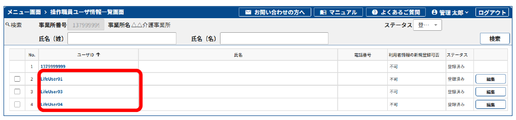 ※ユーザID、パスワード、職種以外の情報は移行されないため、[操作職員ユーザ情報一覧]画面の氏名や電話番号は空欄になっています。