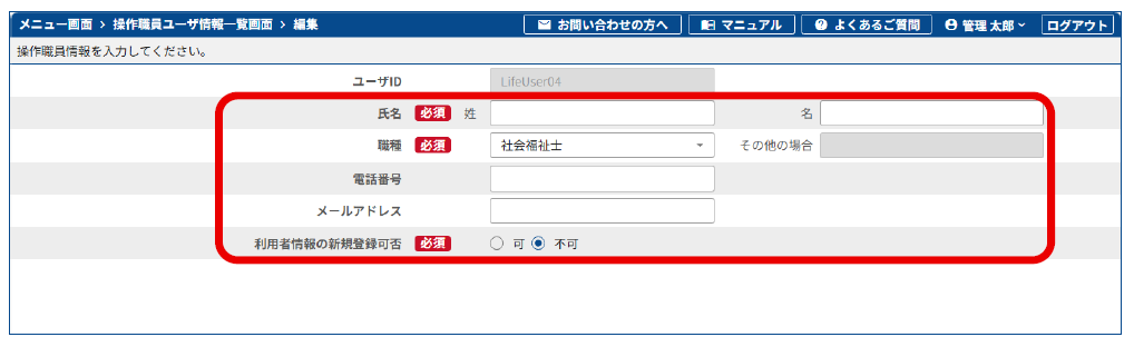 管理ユーザ情報は、ログイン ID、パスワード、職種以外の情報の移行がされないため、管理ユーザは、国保中央会LIFEで職種以外の管理ユーザ情報を再入力します。
