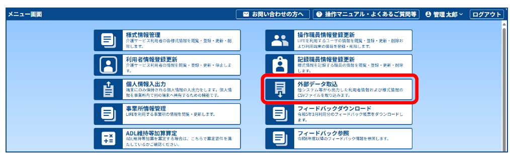 2.LIFEのメニュー画面で[外部データ取込]をクリックします