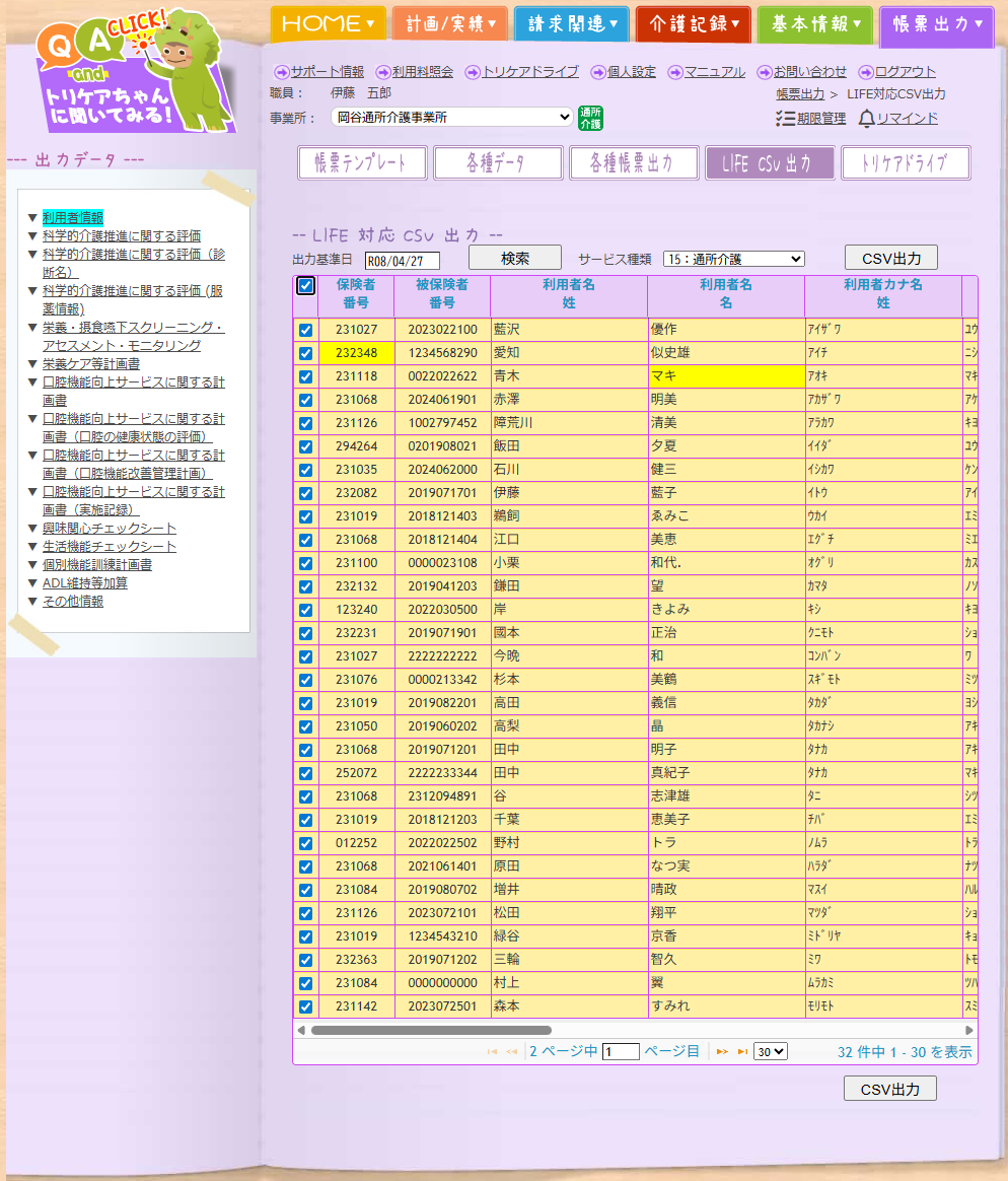 LIFE対応の介護ソフトより、CSV形式で利用者情報を出力します。トリケアトプスでは、LIFE CSV出力>利用者情報の画面から、「CSV出力」していただくことで、LIFE用の利用者情報データを出力することができます。出力したCSVファイルはお使いのパソコンに保存されます。