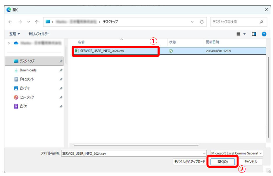 4.取り込むCSVファイル(①)をクリックして、[開く](②)をクリックします
