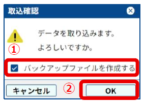 6.[取込確認]画面が表示されたら、[バックアップファイルを作成する](①)にチェックを付けて、[OK](②)をクリックします