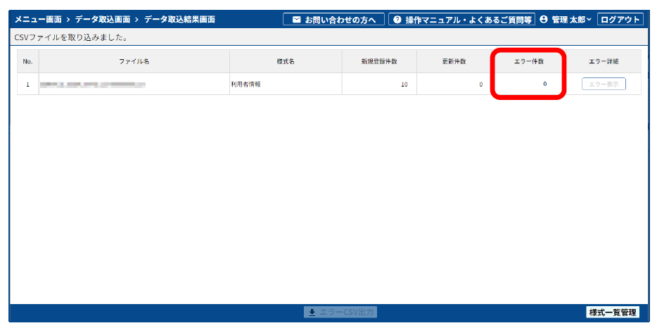 取り込んだすべてのCSVファイルの[エラー件数]が0になっていれば、取り込みは成功です。[エラー件数]が0でないCSV ファイルは、取り込みに失敗していることを表しています。その場合は、「エラー内容を確認する」を参照して、エラーを解決します。