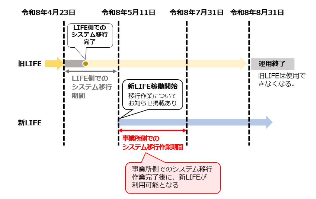国保中央会運用LIFEに移行するには、令和8年5月11日から令和8年7月31日までに、事業所側でのシステム移行作業を行う必要があります。事業所は、期間内であれば任意のタイミングで移行作業を実施できます。ただし、移行完了までに最長3日を要するため、早めに移行作業を実施してください。